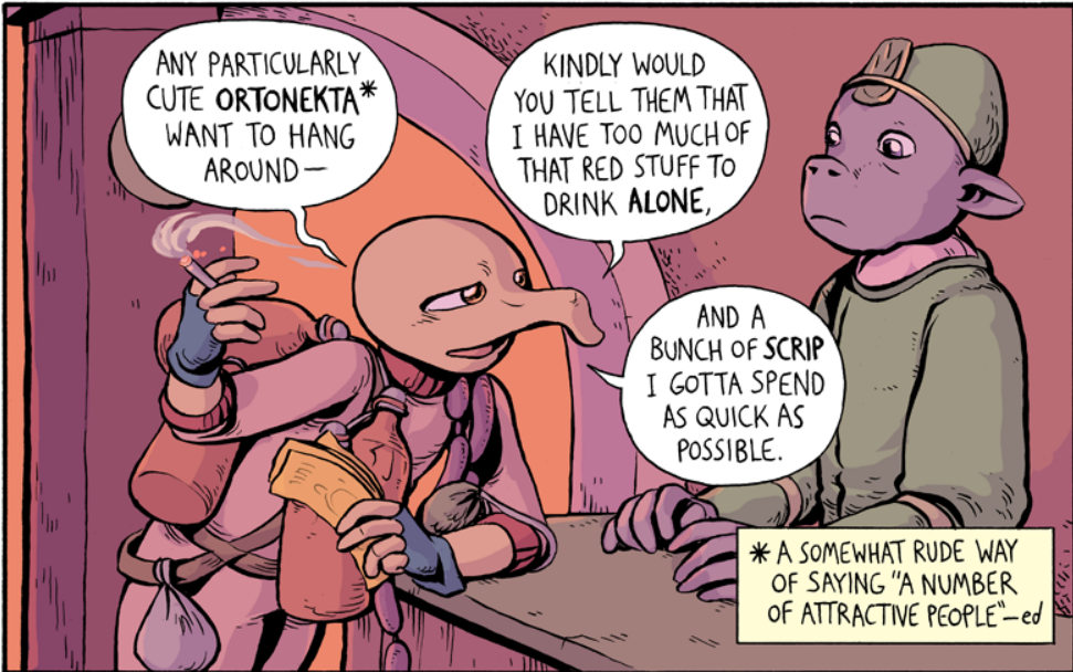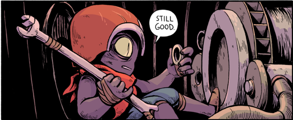 It’s a refreshingly vague comic, concerned not with lore or a grand adventure or a big bad to defeat or a romance to be had. We, generally, follow Spondule and Navichet, two Gleaners (junk collectors…kinda….sorta) who traverse the wastes, going from keep to keep selling and trading what they find to make ends meet. The two met up…at some point (again, refreshingly vague) and seem to have a close yet slightly adversarial relationship. Or at least Spondule has this attitude, hot head that he is.